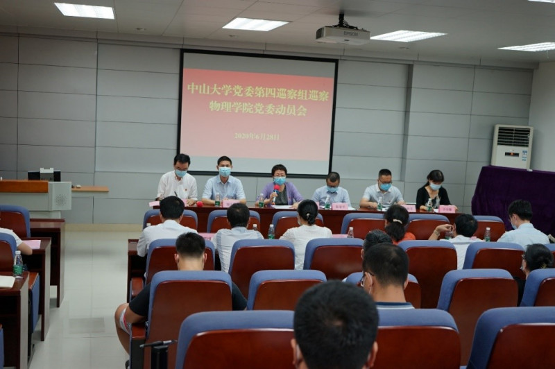 根据学校党委第四轮巡察工作统一部署,2020年6月28日下午,学校党委第四巡察组巡察物理学院党委工作动员会召开。会前,学校纪委副书记、巡察办常务副主任阮映东同志主持召开了巡察组与被巡察单位党政主要负责人的见面沟通会,校党委副书记国亚萍同志强调了学校党委对本次巡察的工作要求。动员会上,学校党委第四巡察组组长陈省平同志做了巡察工作动员讲话,校党委副书记国亚萍同志就配合做好巡察工作提出了要求,物理学院党委书记许东黎同志作表态发言。动员会由物理学院院长郑跃同志主持。学校党委宣传部常务副部长漆小萍同志,校纪副书记、巡察办常务副主任阮映东同志,学校党委第四巡察组全体成员,学院领导班子成员、党委委员、系所中心负责人、学科带头人、党支部书记、师生代表等40余人参加会议。