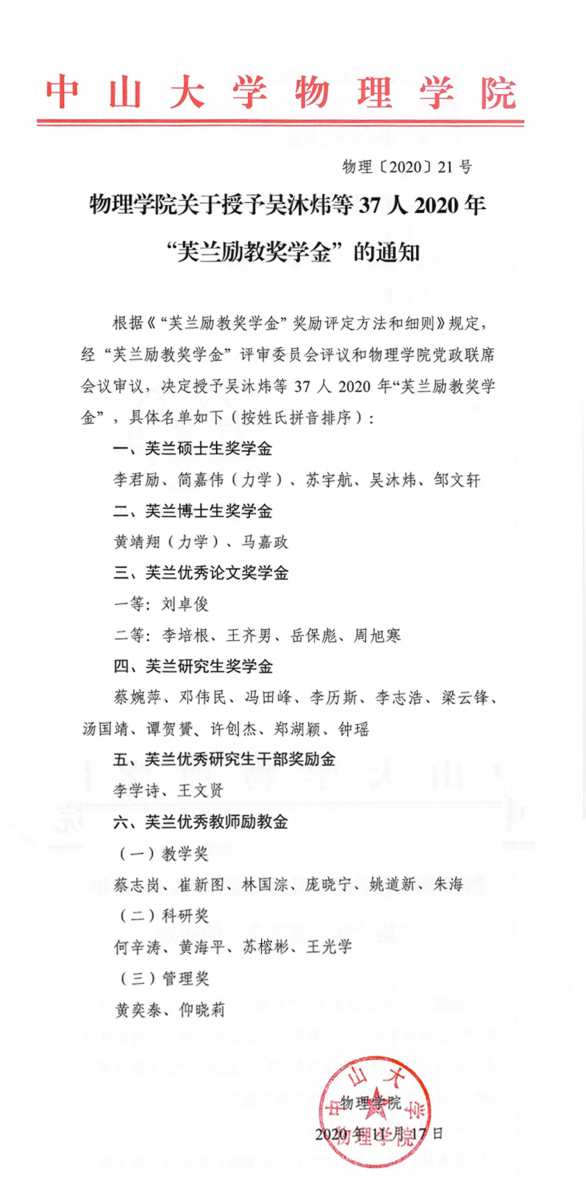 物理学院关于授予吴沐炜等37人2020年“芙兰励教奖学金”的通知