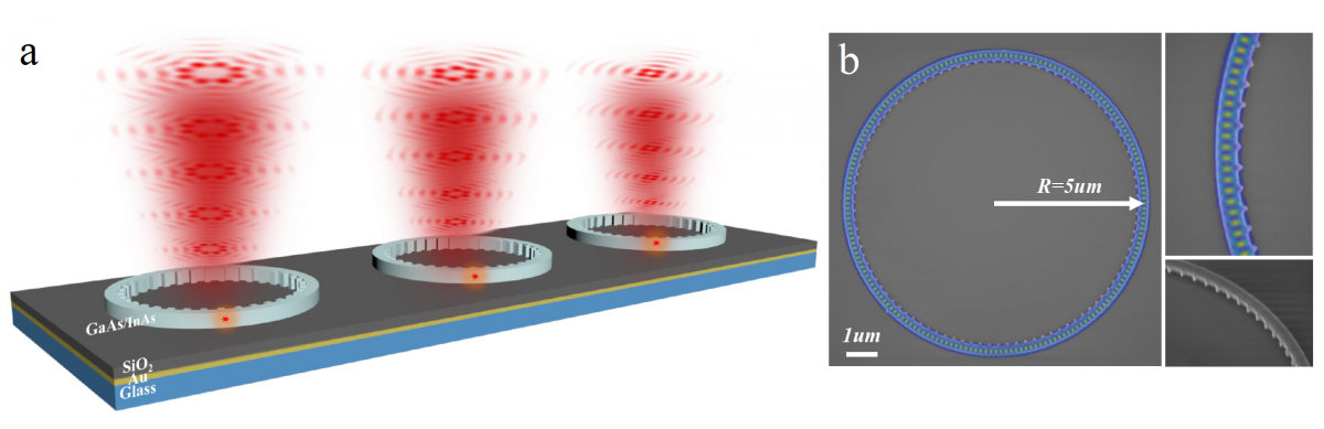 图.嵌入量子点的微环谐振腔产生携带OAM量子叠加态的单光子源示意图及样品实物图