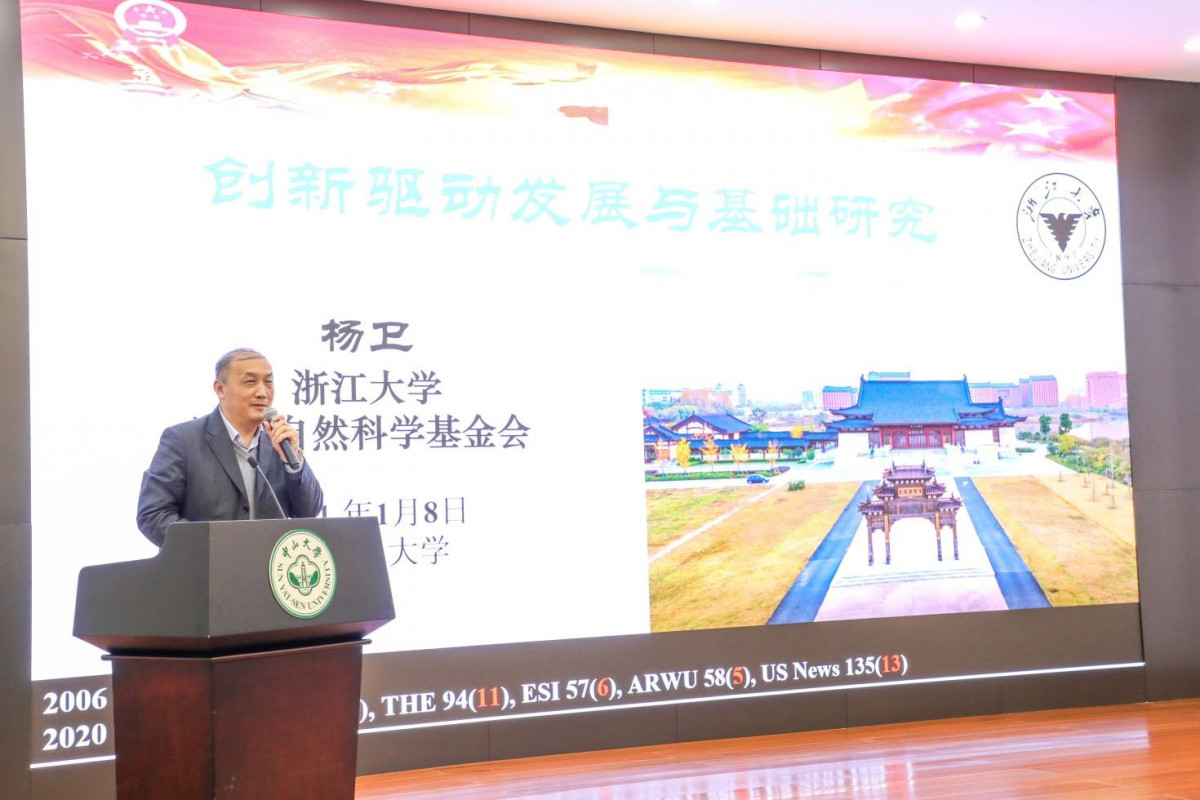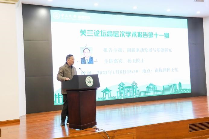 2021年1月8日下午,物理学院芙兰论坛高层次学术报告第十一期于中山大学南校园怀士堂举行。此次作客论坛的嘉宾、原国家自然科学基金委员会主任、浙江大学校长杨卫院士在题为“创新驱动发展与基础研究”的报告中,和与会师生分享了中国基础研究如何解决“卡脖子”问题的思考。论坛由周建英教授主持,罗俊校长、邰忠智副校长以及我校多个学院师生出席了本次论坛。