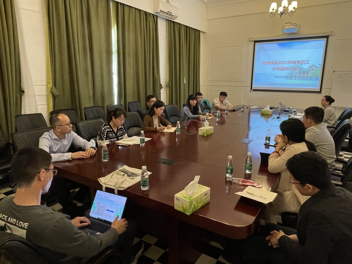 3月10日中午,物理学院党委召开学生工作专题研讨会,暨学习习近平总书记看望参加政协会议的医药卫生界、教育界委员时的重要讲话精神专题会议。学院党委书记许东黎、副书记黄婧、院长助理项泽亮教授,以及学院全体青年教师专职辅导员、党政专职辅导员等14人参加了会议,会议由黄婧副书记主持。