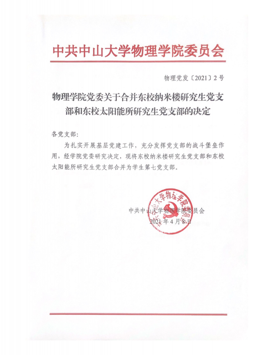 » 物理学院党委关于合并东校纳米楼研究生党支部和东校太阳能所研究生党支部的决定