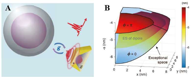 近日,中山大学物理学院王雪华教授等人提出可以利用大尺寸自组装量子点的非偶极效应突破几何空间维度的限制,在等离激元-量子点耦合量子系统中首次构建三维量子奇异点空间。在该系统中,自组装量子点波函数的不对称性使其具有通常的偶极矩外,还存在四极矩、八极矩等高阶跃迁矩。通过利用局域等离激元表面附近巨大的电磁场梯度,该研究揭示高阶跃迁对自发辐射速率的贡献可数倍于偶极跃迁。偶极-多极跃迁干涉导致的显著非偶极效应一方面增强了等离激元-激子相互作用,使其更容易达到强耦合;另一方面,更重要的是为调控等离激元-激子相互作用强度增加一个额外的自由度。其将等离激元-激子耦合量子系统中的二维奇异面拓展为三维奇异腔(exceptional chamber),使得耦合量子系统更容易制备于奇异点附近。该研究工作中展示的量子点非偶极效应可与广泛使用的基于金属探针的扫描隧道显微镜技术相结合,为实验上观测奇异点的量子效应和实现超灵敏量子传感等量子应用提出了一个重要的解决方案。