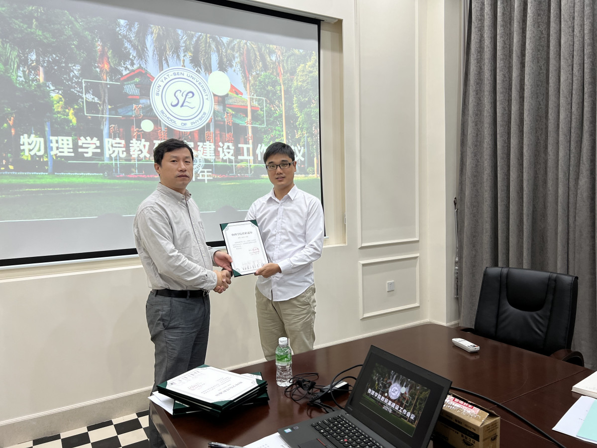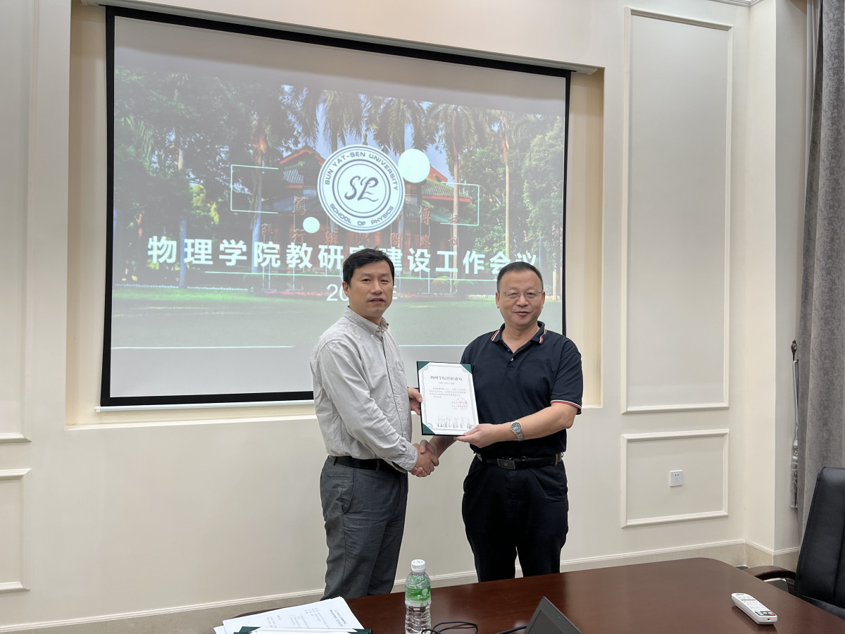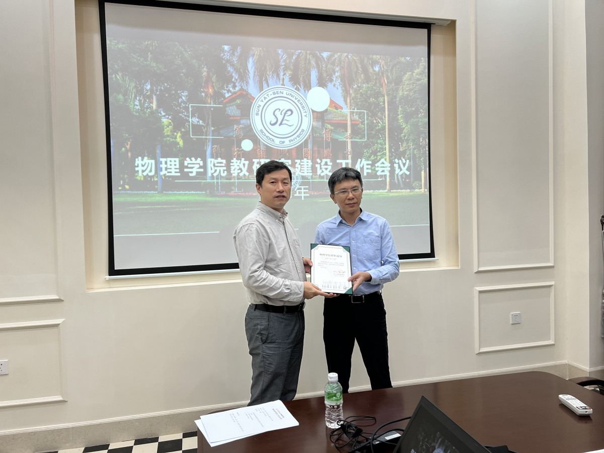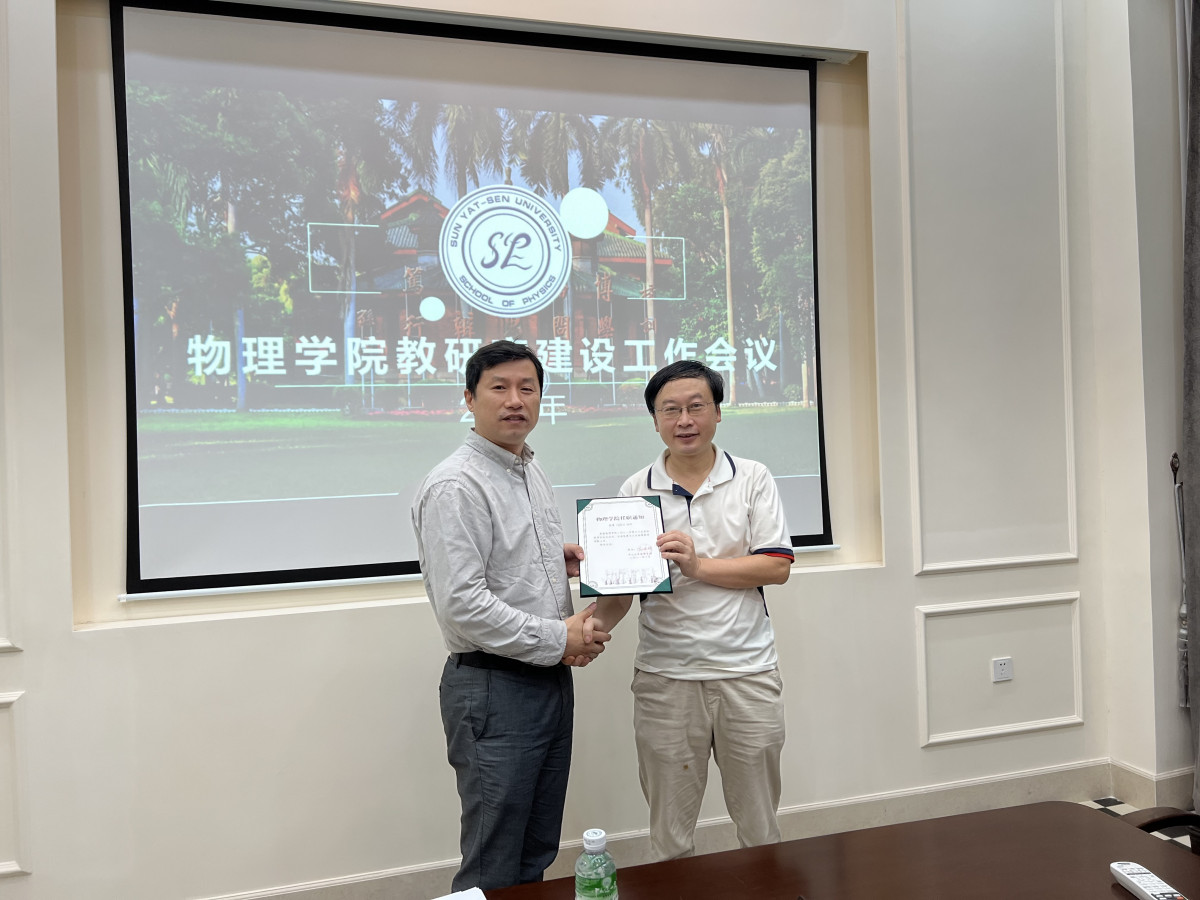2021年10月13日,我院在十友堂111会议室召开了本科教研室建设工作会议。赵福利书记宣读学院任命文件,郭东辉院长为新任教研室主任及公共物理教学部主任、副主任颁发任命证书。参会人员结合2020学年第2学期学生评教结果、督导评教报告、本科教学信息反馈委员会完成的《物理学院本科课程评价报告》以及《中山大学物理学院教研室建设实施方案》对教研室工作以及如何持续提升教学质量进行了研讨。王猛副院长主持会议。