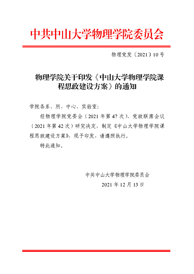 物理学院关于印发《中山大学物理学院课程思政建设方案》的通知