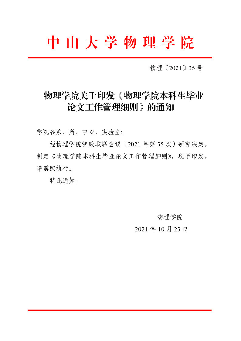 物理学院关于印发《物理学院本科生毕业论文工作管理细则》的通知