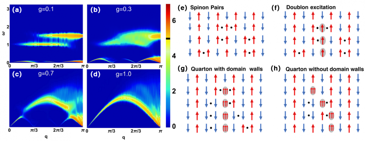 图2:(a)—(d)为动量空间中通过量子蒙特卡洛方法得到的磁激发能谱;(e)—(f)为实空间中自旋子、双重子和四重子的示意图。