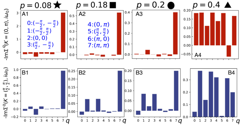 他们进一步使用最新发展的涨落诊断方法分析电子的自能,并由此发现,在这个奇异金属区间,电子的散射绝大部分是由反铁磁涨落所导致的(如图2所示)。结合系统磁关联函数等数据的分析,并对比历史实验数据,他们提出,在奇异金属态(16%~20%掺杂),虽然过量的空穴掺杂致使系统的磁关联被极大削弱了,但其仍然可以贡献电子的大部分散射过程。只有系统进入极度过掺杂区域(>30%),电子的散射才转变为单电子之间的单体碰撞,从而其可由费米液体理论描述。该项工作对高温超导体奇异金属态的物理起源做出了清晰合理的预测和判断,有望对该领域的发展和进步起到重要的推动作用。