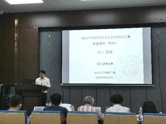 为提升青年教师教学能力和学院教学水平及人才培养质量、加强师风师德建设和人才队伍建设,物理学院于2022年4月29日下午在哲生堂307举行2022年度教师教学竞赛。周舟、汤亦蕾、王慧超和邬汉青四位教师参加授课比赛,学院青年教师到现场观摩学习。本次教学竞赛由物理学院退休教授、教学名师罗蔚茵、黄迺本教授,物理学院副院长王猛教授,光学系主任、校级教学竞赛获奖人周张凯教授以及学生代表李锶阳担任评委。物理学院郭东辉院长和赵福利书记观摩教学竞赛并致辞。