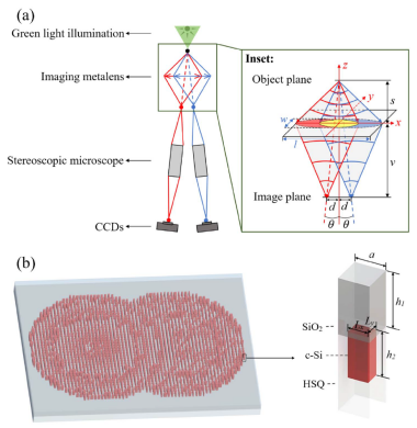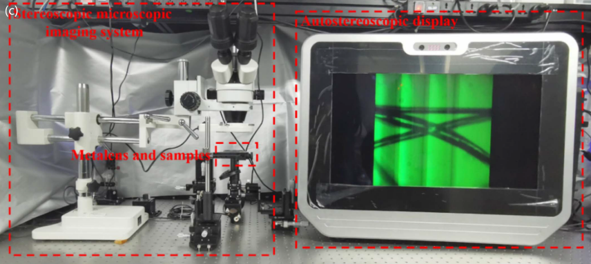 (a)体视超构透镜成像原理图; (b)体视超构透镜示意图; (c)体视显微系统实物图