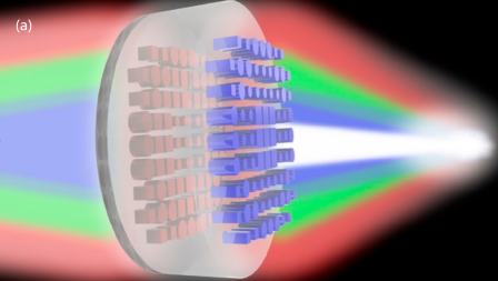 a)双层超构透镜示意图; (b)实际超构透镜表面图; (c)三基色消色差数码成像图
