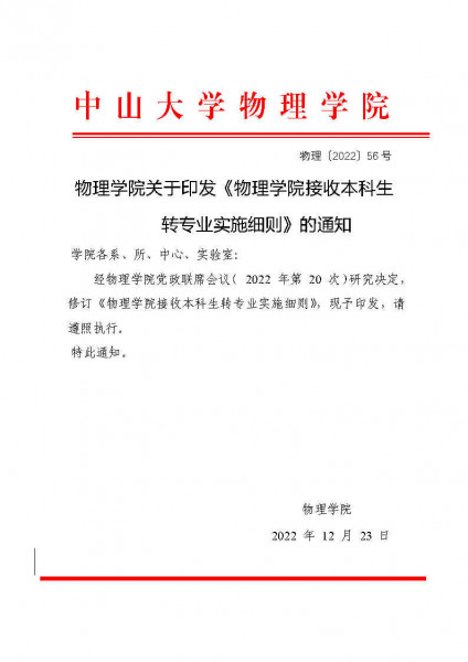 » 物理学院关于印发《物理学院接收本科生转专业实施细则》的通知 物理〔2022〕56号