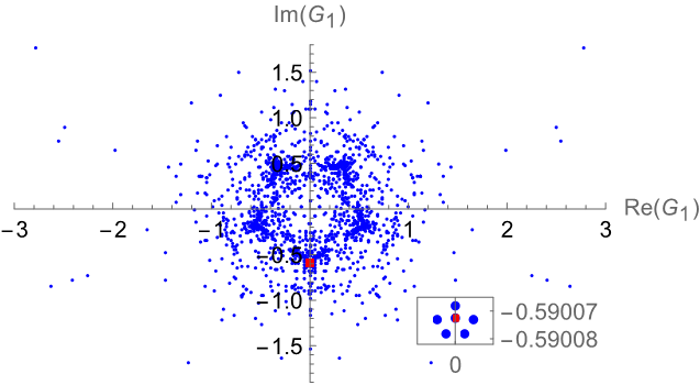 图1. 非厄米iφ^3理论中一点格林函数的解在复平面上的分布。蓝色点表示戴森-施温格方程的近似解,红色正方形表示具有PT对称性的精确解。近似解的五个聚集点对应于具有五重对称性的精确解。