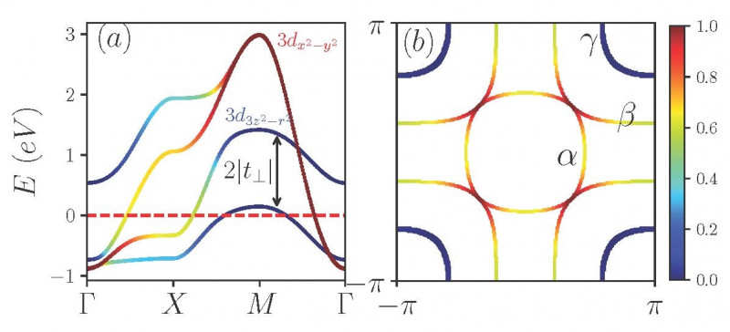 图二:双层两轨道模型给出的(a)电子能带(b)费米面