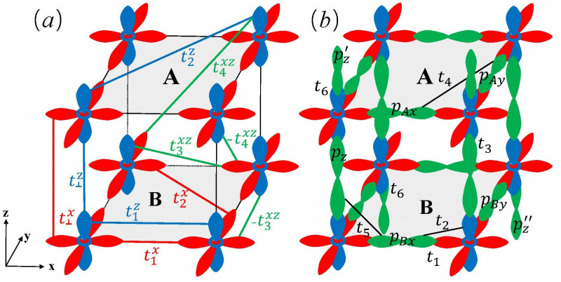 图一:轨道分布和电子跃迁 (a) 双层两轨道模型 (b)11轨道模型