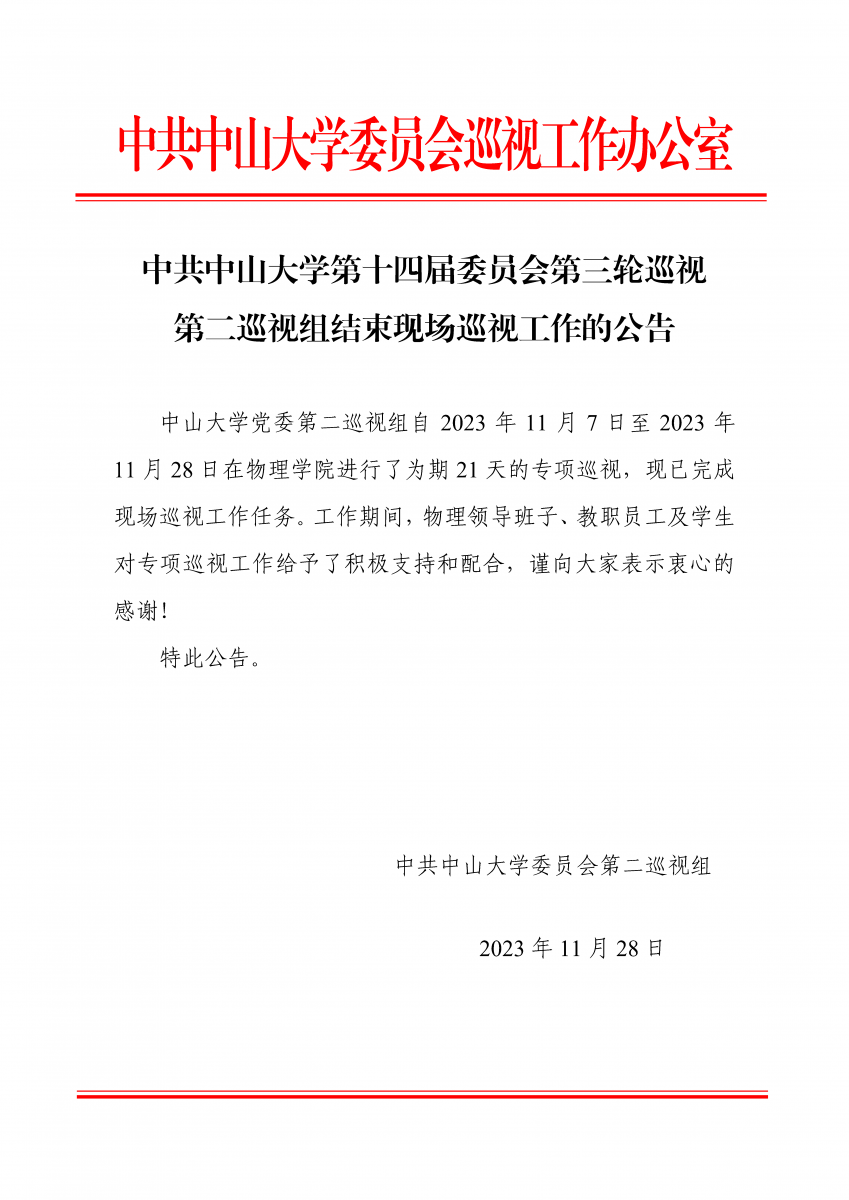 » 中共中山大学第十四届委员会第三轮巡视第二巡视组结束现场巡视工作的公告
