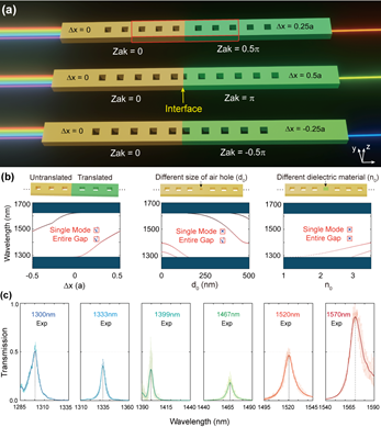 研究团队将光子晶体纳米桥中空气孔的“平移参数”作为新的合成维度,提出了一种基于合成平移维度的片上拓扑光子晶体纳米桥滤波器的设计方案。如图1(a)所示,将不同平移量的光子晶体纳米桥拼接形成拓扑光子晶体纳米桥微腔。由于拼接处左右光子晶体具有不同的扎克相位(Zak phase),因此界面处支持局域腔模。进一步改变拼接处右侧光子晶体的平移量,从而实现了不同波长的光输出。基于合成平移维度设计的拓扑光子晶体微腔相较于基于缺陷结构的传统光子晶体微腔具有多个优势。如图1(b)所示,基于缺陷结构的微腔存在腔模波长覆盖范围窄或非单波长滤波等问题。然而,基于合成平移维度的拓扑微腔,通过空气孔平移量的改变,微腔腔模可以覆盖整个光子晶体禁带带隙(>300 nm,覆盖光通信波段的大部分O波段,整个E,S,C波段以及大部分L波段)。且每个微腔仅支持单个腔模,可以实现单波长滤波。实验上,研究团队制备了具有不同平移量的片上拓扑光子晶体纳米桥样品,如图1(c)所示的测量结果证实了片上拓扑光子晶体纳米桥滤波器在宽波长范围内的选择性单波长滤波。