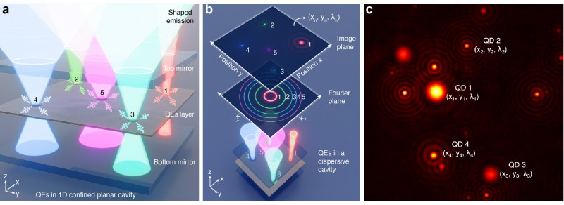 量子辐射子与微纳光子结构的确定性耦合对于探索光与物质的相互作用、制备高性能的光量子器件、构建可扩展的光量子集成芯片等至关重要。然而, 量子辐射子的空间位置与光谱的随机性往往导致其与微纳光子结构模式的失配, 严重阻碍了高性能量子光源的实现及应用。精准确定每个量子辐射子的空间位置和辐射波长是解决这一重大挑战的关键,为此,中山大学王雪华/刘进教授研究团队,提出和开发了量子辐射子的超分辨和高光谱快照式荧光成像方法与技术,它能同时对大量的量子点进行高精度的空间定位和光谱分辨,并基于该技术实现了高性能微腔量子光源器件的规模化确定性制备。这一技术巧妙利用纳米光子平面微腔的色散关系对量子点远场荧光辐射的调控作用,仅通过单次成像便可同时获取多个量子点的空间位置信息和光谱信息,其空间定位与波长分辨精度分别达到15 nm 和0.4 nm。这项研究突破了传统成像技术只能获取量子点位置信息的限制,解决了量子点与微纳光子结构无法确定性耦合的难题,可为量子辐射子的快速全面表征、光量子功能器件的批量制备、可扩展光量子芯片的研发、超分辨生物成像等提供关键技术支撑,将进一步推动量子信息技术与经典光学成像技术的发展。