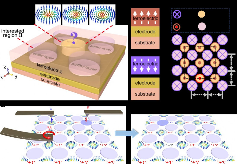 图1:在单层四方铁电薄膜中创建弱关联极性斯格明子状织构的示意图。a 180度柱状纳米畴阵列嵌入铁电薄膜。极性拓扑态可能在柱状纳米畴之间的区域(标记为“interested region Ӏ”)和最初被柱状纳米畴占据的区域(标记为“interested region Ⅱ”)形成。b 引入空间调制的内建场稳定柱状纳米畴,内建场的方向和强度取决于界面环境。c 柱状纳米畴及interested regions的分布。d 示意图:对单个Bloch型斯格明子的局域擦除/写入和确定性手性控制。