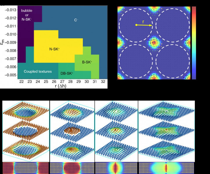 图2:基于畴工程策略,在PTO薄膜中形成的平衡极化态。a 稳定性相图。b 在PTO薄膜中间层形成的拓扑荷Q = +1的Bloch型斯格明子(B-SK+)。c 四种主要斯格明子状极化织构的三维结构。