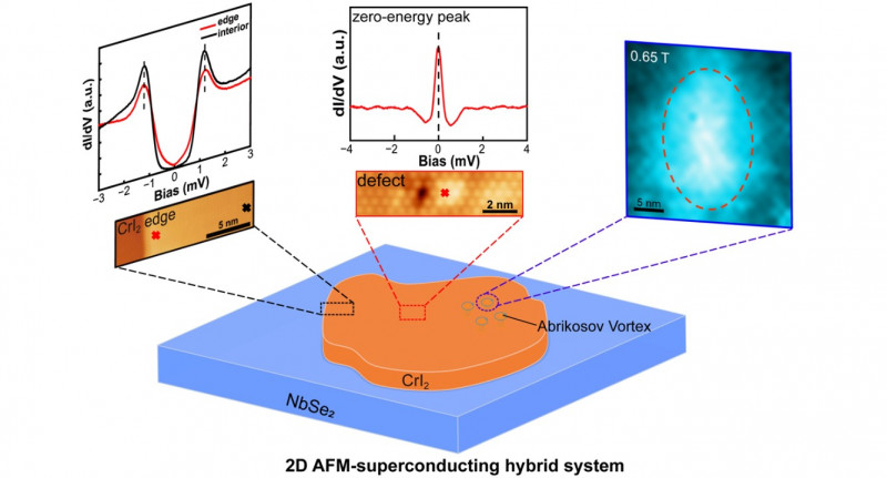 钟定永教授团队开展低维与表面小量子系统的精准构筑及量子物态调控研究,在二维磁性体系的可控制备和原子尺度物性研究方面积累了丰富的经验(Sci. Bull. 65, 1064-1071 (2020)、ACS Appl. Mater. & Interfaces 15, 19574 (2023))。最近,他们通过分子束外延技术在NbSe2超导衬底表面实现了高质量单层CrI2反铁磁薄膜的外延生长,得到了二维CrI2-NbSe2异质结。他们利用扫描隧道显微镜对异质结在低温下可能出现的新奇量子态进行探索,发现在二维CrI2岛内部仍然可以探测到典型的超导能隙,但在二维岛边缘处存在能量处于超导能隙内的边缘态。同时他们发现,在CrI2内部有些结构缺陷处存在缺陷诱导的零偏压电导峰,可能是体系中存在马约拉纳零能模的实验证据。在施加外磁场后,CrI2-NbSe2异质结表面的磁通涡旋打破了NbSe2超导衬底原有的三重旋转对称性,表明外延CrI2层对界面超导态产生了有效调制作用(图1)。研究团队结合理论数值模拟和第一性原理计算,进一步建立了二维反铁磁绝缘体-s波超导杂化系统的唯象理论模型,揭示该体系可以实现陈数为偶数的拓扑超导态,这为实验上的发现提供了一个定性的自洽理解。该研究工作为探索拓扑超导态和马约拉纳边缘态提供了一个极具吸引力的平台。