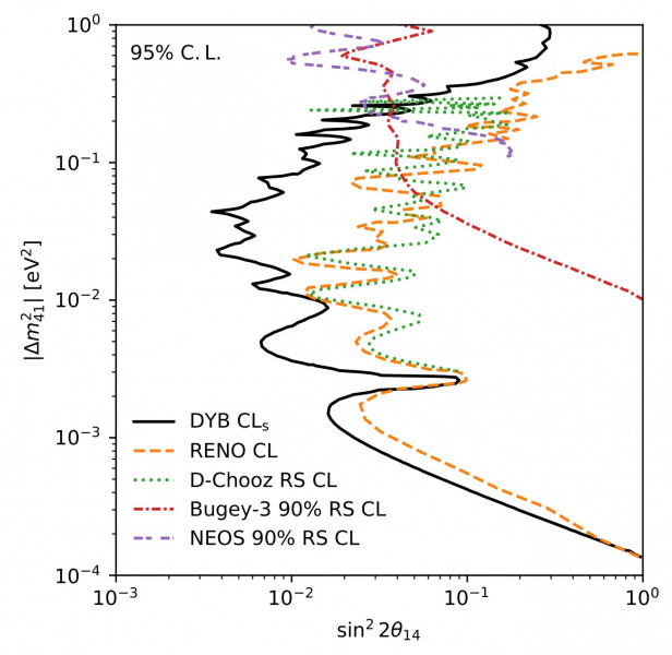 图1:利用大亚湾(DYB)全数据集得到的惰性中微子排除曲线,以及与其他实验的比较。曲线右侧的区域被排除。
