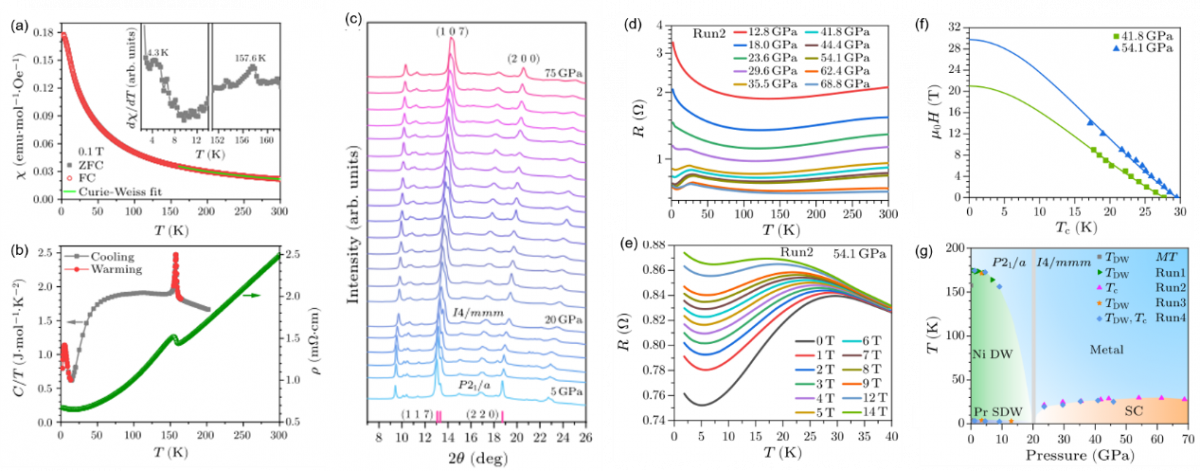 ▲Pr4Ni3O10-δ磁性、比热、结构及压力下的电输运测量结果