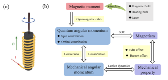 图1 爱因斯坦-德哈斯效应。(a)实验装置;(b)理论机制。