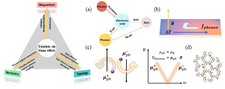 图2 爱因斯坦-德哈斯效应联系起磁学、拓扑、力学。(a) 超快退磁过程;(b)声子热霍尔效应;(c)声子磁矩;(d)手性声子。