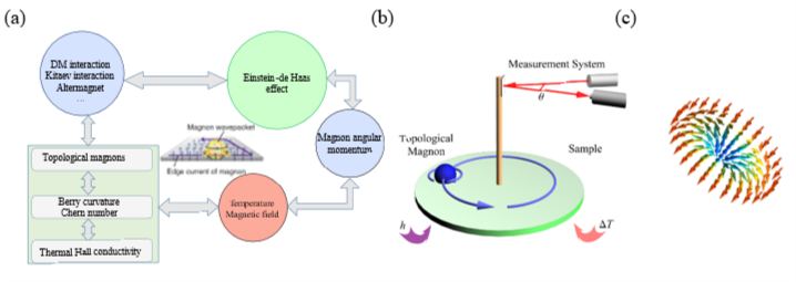 图3 拓扑磁子的爱因斯坦-德哈斯效应。(a)理论机制;(b)实验构想;(c)斯格明子系统。