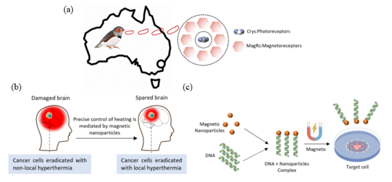 图4 爱因斯坦-德哈斯效应在生物、医学中的应用。(a)磁感现象中的MagRs机制;(b)肿瘤磁热疗;(c)磁性转染。