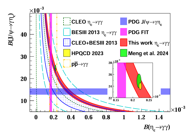 粲偶素是由一对粲夸克和反粲夸克组成的强子,该系统是研究强相互作用基本理论——量子色动力学(QCD)的黄金探针之一。粲偶素的衰变可以同时包含QCD的微扰和非微扰性质,因此可用于检验QCD理论计算。然而,对于最轻粲偶素的简单衰变——正反粲夸克湮灭成一对光子,基于标准模型的理论计算并不能很好地描述实验数据。最新的格点QCD计算结果显示,