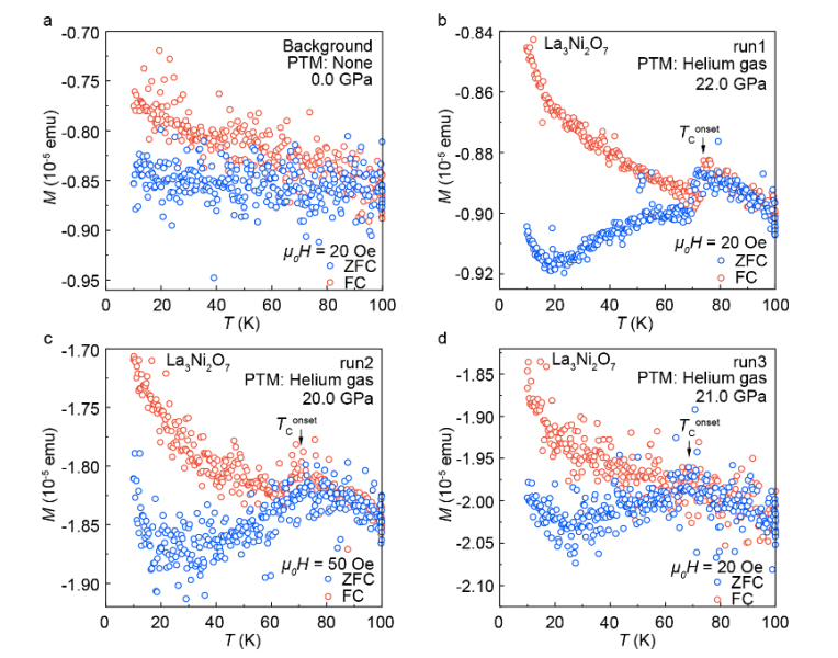 研究团队与上海前瞻物质科学研究院曾桥石团队合作,利用超导量子干涉仪首次在直流磁场下测量到了La3Ni2O7的迈斯纳效应,估算出在22GPa时超导体积超过40%,证实了La3Ni2O7单晶的体超导电性(图2b)。