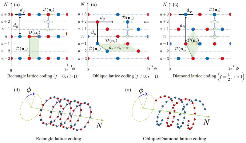 根据晶格对称性,研究人员分析了矩形、斜方、菱形晶格的数-相位晶格码,发现矩斜方晶格和菱形晶格编码等全新量子纠错码的激发数和相位变量(具有周期性)相互关联,表现出“数-相位涡旋”特性:光子数偏移会引发可检测的离散相位旋转,由相位测量即可识别错误而无需传统的激发数宇称测量。该 “数-相位涡旋”结构可作为独立量子纠错资源,并发展新型纠错机制。