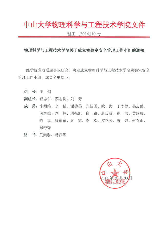 » 理工[2014]10号成立实验室安全管理工作小组的通知