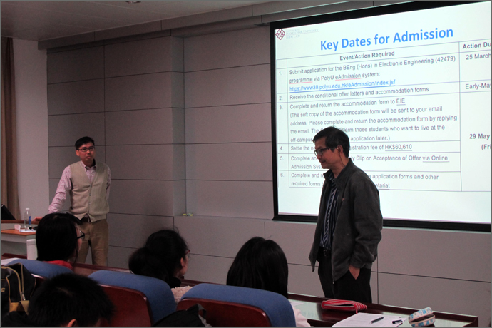 交流会在十友堂300课室进行。香港理工大学老师为即将于2015年赴港学习的2013级微电子2+2的同学们介绍了本次申请赴港的流程,包括了网上申请、缴纳学费、住宿安排、Student VISA的办理及其它注意事项,并解答了同学们关于缴费、课程、就业等各种问题。