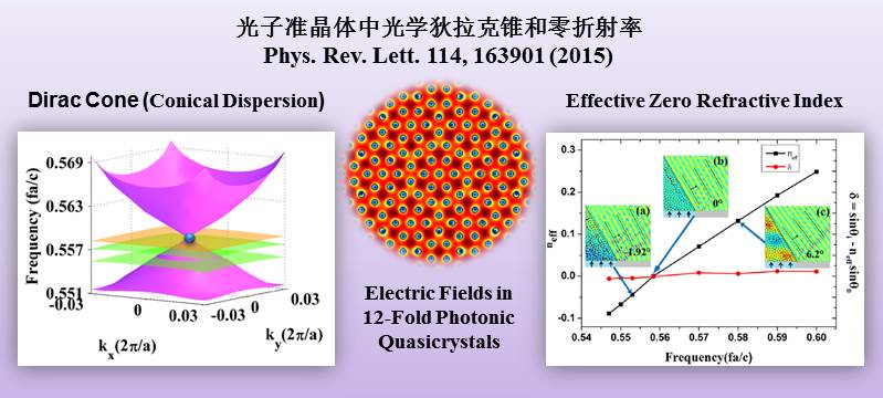 光子晶体中存在一种拓扑非平庸的奇点,在奇点附近的光子能带是线性的,称为光学狄拉克锥。光学狄拉克锥与众多科学和应用领域关系密切,如零折射率、拓扑光子学、位相调控、单向传输等。通常认为,光学狄拉克锥要求光子晶体具有完整周期性。那么,当周期性被破坏后,结构中是否仍能保证有狄拉克锥,是否仍能具有等效零折射率呢?最近,董建文教授等在光子准晶体中肯定地回答了这一科学问题,相关研究成果发表于国际著名学术刊物《Phys. Rev. Lett.》。[Phys. Rev. Lett. 114, 163901 – Published 20 April 2015]